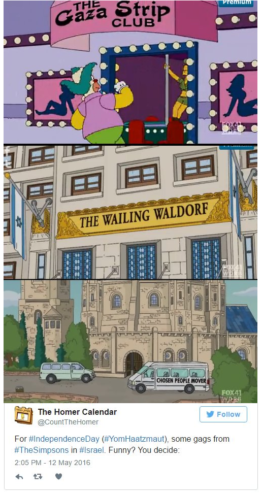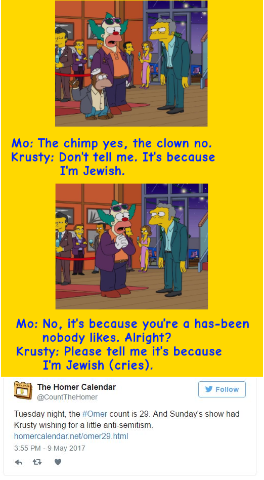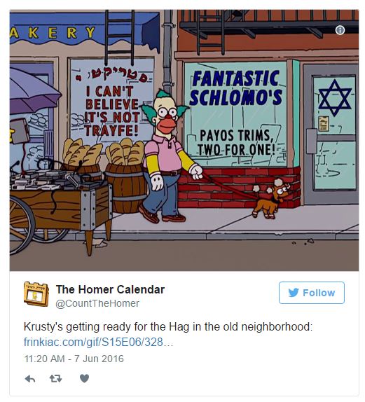 The Homer Calendar, perhaps the internet's only Simpsons-themed ritual countdown of the days between Pesach and Shavuot - the Omer - is turning 18 this year. The site, which, along with a Facebook page, doubles as a constantly updated chronicle of every known Jewish-related joke in the show's history, still has a nostalgically low-tech Web 1.0 look to it. But it hasn't always been a smooth journey for Brian Rosman, the calendar's creator, a healthcare access advocate who lives in the Boston area and is a Simpsons Jewish humor completist: After all, he watches each new episode, even a decade into the show's horrific and unwatchable twilight. "I still have to watch it every week just in case there's something Jewish that pops up," he said. "I started watching this with my kids when they were quite young, and now they're all out of college."The payoff for these irrevocable hours of depressingly and often insultingly awful new Simpsons episodes is the occasional Jewish-inflected reminder that the show is somehow still capable of winning a hard-earned laugh or two. In an episode this past week, Rosman explained, Krusty the Clown shows up at Moe's fancy new rooftop bar, and begs to be let in. Moe says no. "Don't tell me it's because I'm Jewish," the clown pleads. "No, it's because you're a has-been nobody likes," says Moe. "Please say it's because I'm Jewish!" Krusty bellows. Pretty good!