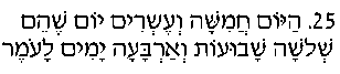 Hayom chamishah v'esrim yom, sh'hem shloshah shavuot u-arba'ah yamim la'omer.
